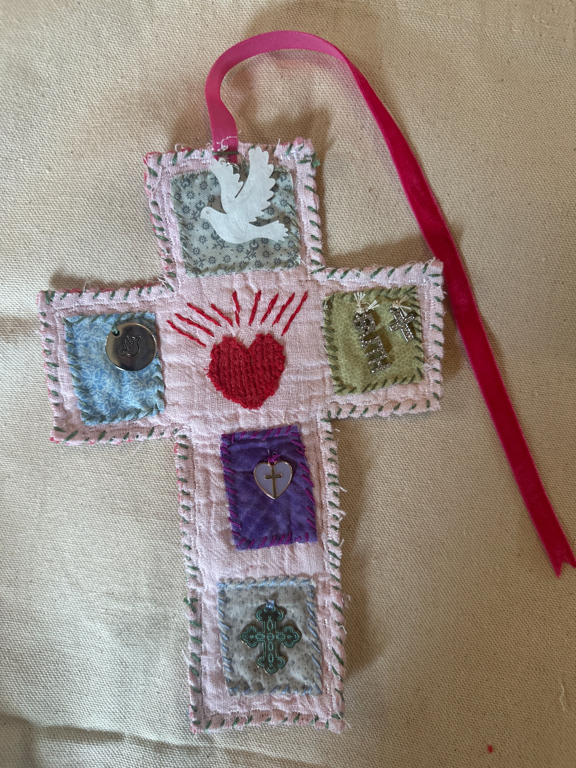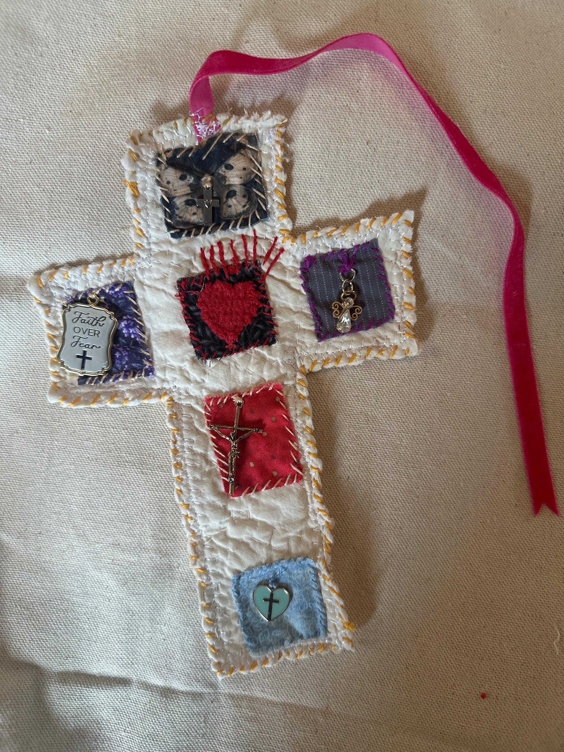 Handmade and specially curated to create handheld devotionals. These are hand-stitched and meant to be traveled with or to create a quiet moment of reflection anywhere you are. Along with the curated charms you can add more to it with your own collected special religious pieces!
