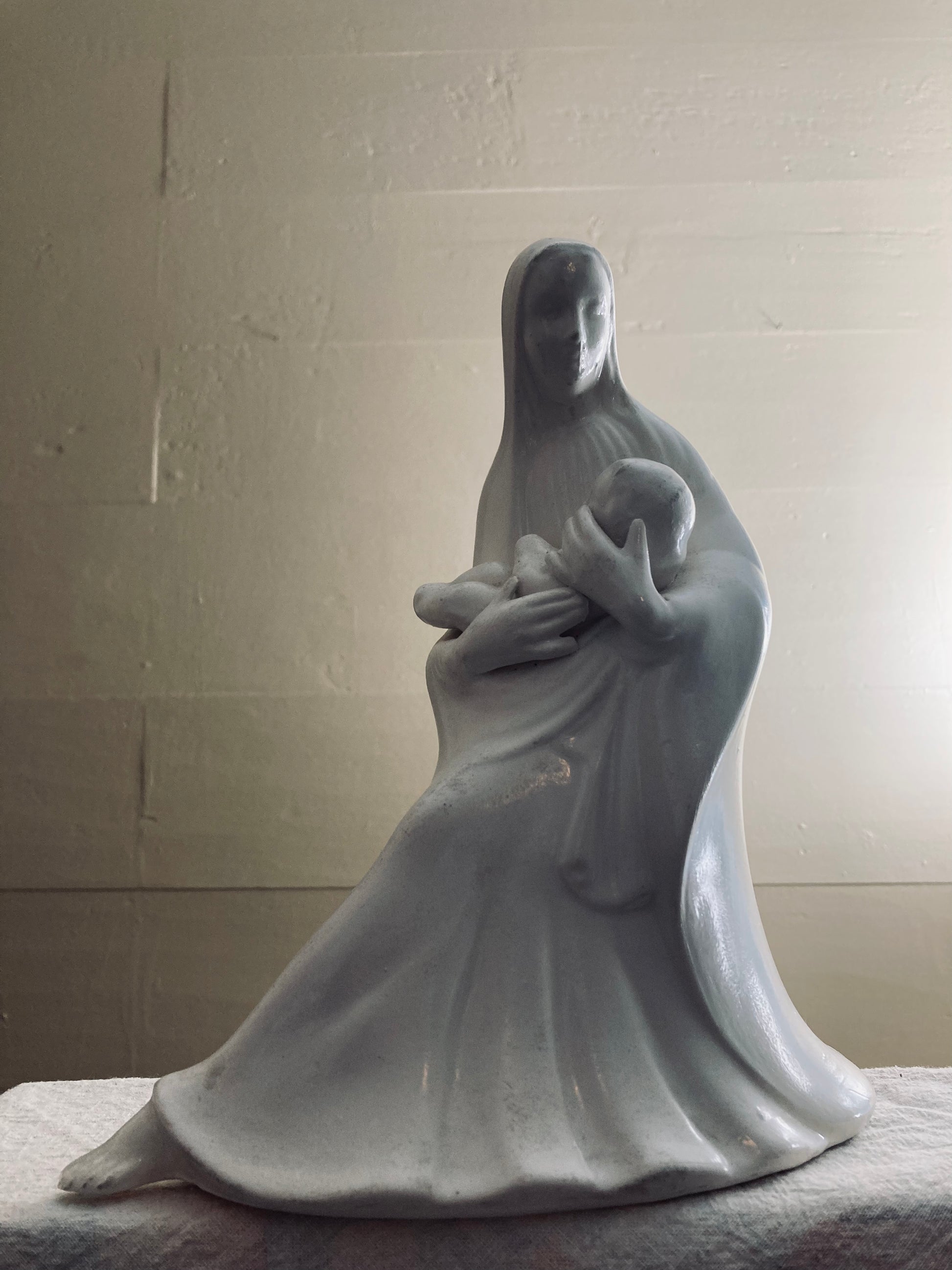 White ceramic sculpture of mother & child